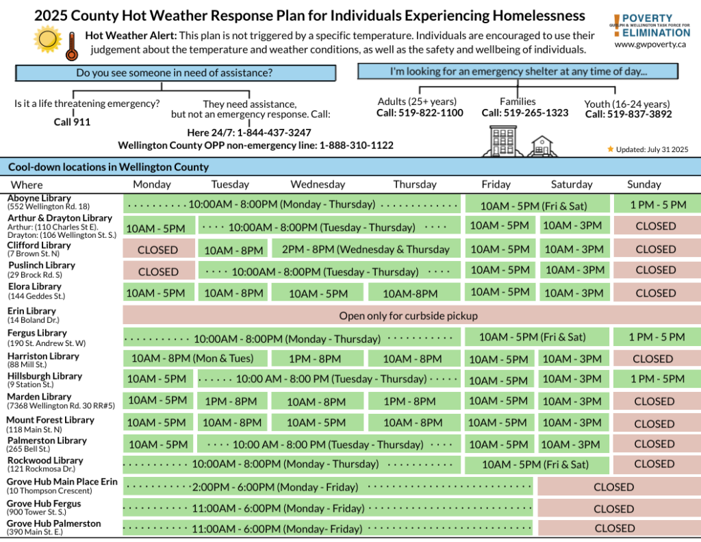The Guelph & Wellington Poverty Elimination Collaborative is working with community partners again this year to develop a Community Hot Weather Response Plan for Individuals Experiencing Homelessness. This plan outlines a protocol for the 2025 hot weather season to support individuals experiencing homelessness to access and get to emergency shelters and cool-down locations in periods of hot weather. This plan is partnership of: The Guelph & Wellington Poverty Elimination Collaborative, Stepping Stone, Wyndham House, Royal City Mission, The County of Wellington, The City of Guelph, Guelph Public Libraries, Hope House, Chalmers Community Service Centre, The Canadian Mental Health Association Waterloo Wellington, Guelph Police Service, and Wellington County OPP.