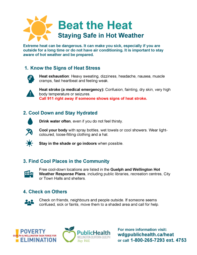 Extreme heat can be dangerous, especially if you are exposed for a long period of time. In partnership with Wellington Dufferin Guelph Public Health we’ve created a document to provide information on how to stay safe in hot weather.
