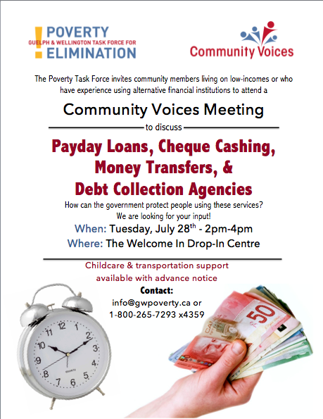 The meeting will focus on how the Government can protect people using services, like Payday Loans, Cheque Cashing, Money Transfers, & Debt Collection Agencies. The Poverty Task Force is preparing a response for the Government and looking to include input from community members with lived experience.